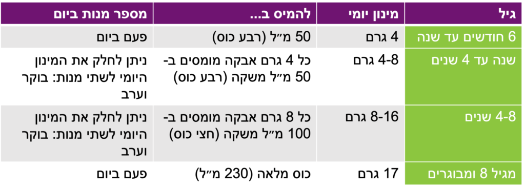 ניתן להמיס את האבקה בכל משקה ובכל טמפרטורה: מים, מיץ, מרק ופורמולה לתינוקות